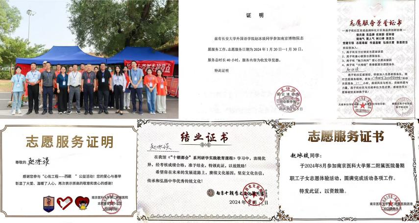 课余时间,赵冰琰积极主动参与到实践活动和公益活动中,并获评2024年长安大学寒假社会实践先进个人。在2024年暑假迎新活动中她作为志愿者,在西安站开展相关志愿服务活动,延续长安大学传统。假期里她协助南京医科大学第二附属医院组织发起的一个免费救助先天性心脏病患儿的健康扶贫项目,“心佑工程”,帮助藏区小朋友进行一系列检查。并且她在南京博物院、南京十朝历史文化陈列馆也参加了相关志愿服务。