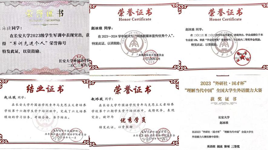 赵冰琰,女,共青团员,长安大学外国语学院2023级英语专业本科生。2023-2024学年,加权成绩88.74,专业排名第一。在2023至2024学年,获得“学业优秀奖”、“国家奖学金”。现任2023级英语专业二班学习委员,长安大学青年传媒中心微信编辑部部门负责人。课余时间,坚持以赛促学,获得2023年全国大学生英语翻译大赛省级三等奖、2023“外研社· 国才杯”“理解当代中国”全国大学生外语能力大赛三等奖、第三届全国高校商务翻译(英语)能力挑战赛二等奖。在第十六期青马班中,被评为优秀学员。获评“军训先进个人”、“网络新媒体宣传优秀个人”、“社会实践先进个人”等荣誉称号。