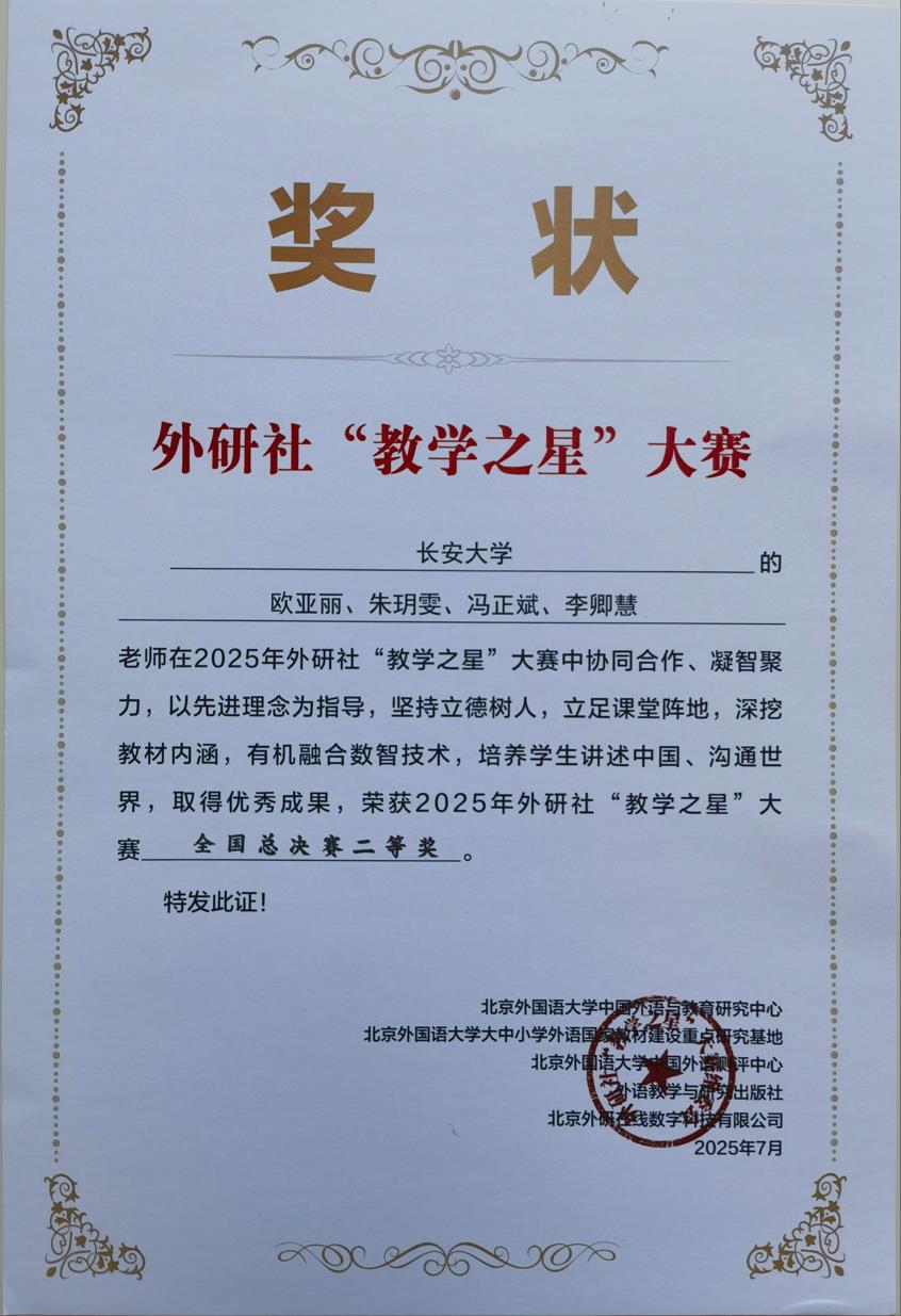 近日,2025年外研社“教学之星”大赛(FLTRP Star Teacher Contest)传来捷报,长安大学外国语学院欧亚丽教师团队表现突出,荣获全国总决赛二等奖。