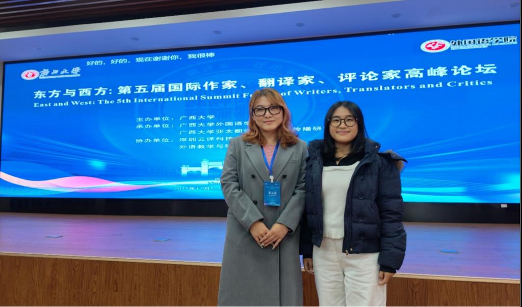 12 月 5 日至 7 日,“东方与西方:第五届国际作家、翻译家、评论家高峰论坛”在广西大学启幕。我院教师秦思携研究生张霞应邀参会,并在分论坛分享学术成果,以专题报告展现了我院在跨文化翻译与文学研究领域的扎实积淀。